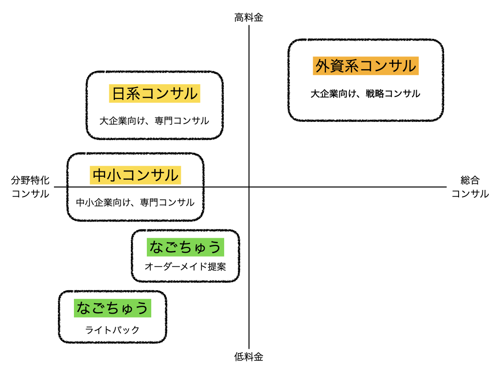 コンサルティング業界において、外資系コンサルティング会社、日系大手向けコンサルティング会社、日経中小企業向けコンサルティング会社となごちゅうサービスを、コンサル領域の幅(専門性)とコンサルティング料金の4軸でポジショニングマップに整理しました。
