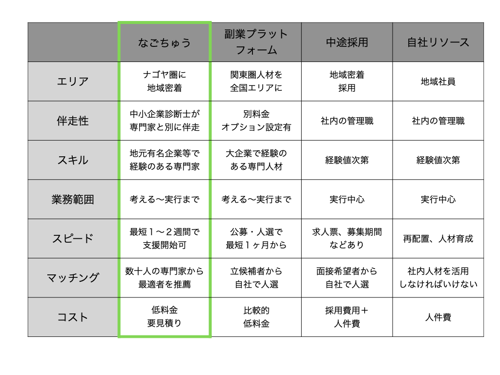 なごちゅうは、名古屋・愛知・岐阜・三重エリアに特化した支援センターです。地元有名企業等で経験のある専門家が多数在籍していますので、地域の実情や業界特性を理解してサポートすることができます。地元企業ならではの課題や顔の見える膝を付き合わせたサポート、地域のネットワークにより横断的な対応をすることも可能です。身近で頼れるパートナーが支援します。